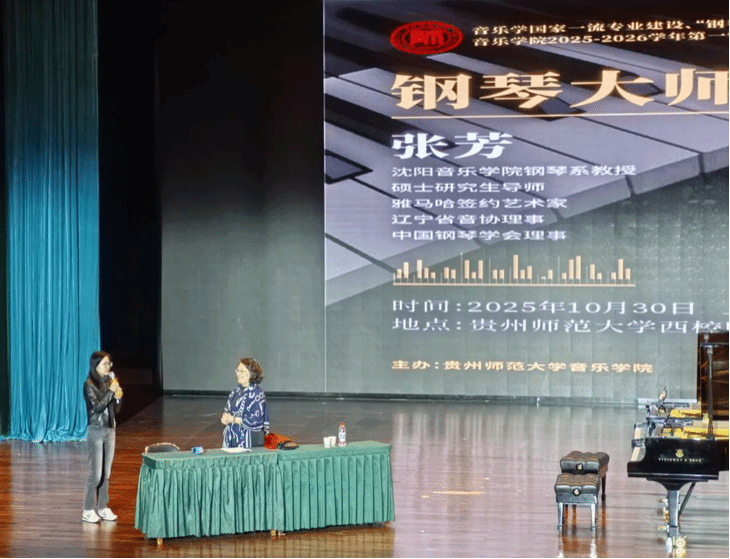 为进一步提升学院钢琴教学水平与师生专业素养,搭建高水平学术交流平台,贵州师范大学音乐学院于2025年10月30日邀请沈阳音乐学院钢琴系张芳教授莅临学院开展专题大师课,以及邀请张芳教授学生进行技能展示。
