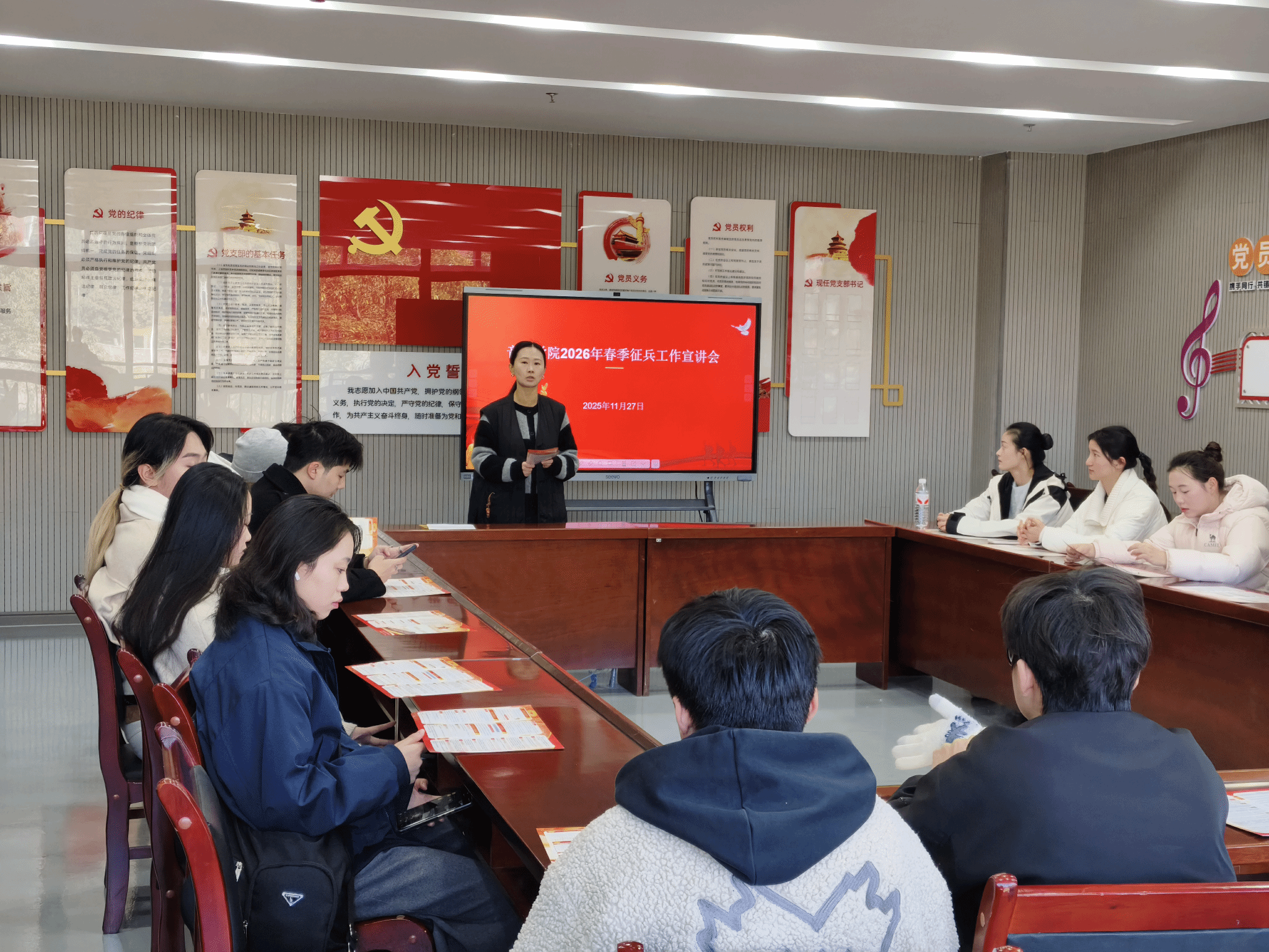 为有序推进音乐学院2026年春季征兵工作,2025年11月27日上午,音乐学院组织2026届毕业生在学院2楼报告厅开展征兵工作宣讲会,本次宣讲会旨在动员广大青年学子投身国防事业,点燃报国热情。