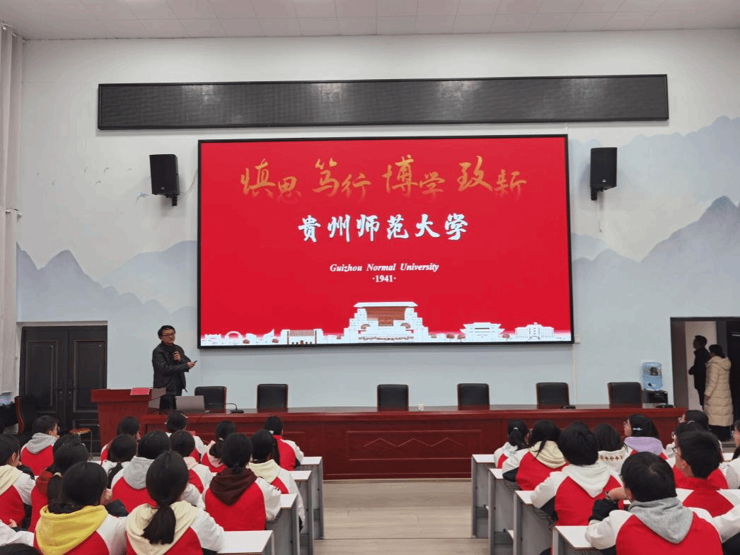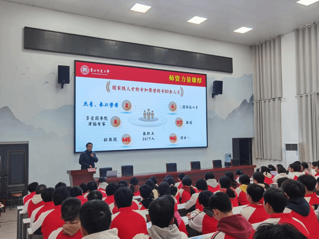陈忠松副院长、杨军副院长分别在石阡中学、石阡民族中学,围绕贵州师范大学历史底蕴、办学理念、师资力量、学科特色及人才培养等视角开展全面介绍,通过现场播放学校招生宣传片、发放招生手册等形式,让在场师生直观感受贵州师范大学的综合办学实力。针对师生重点关注的专业课程设置、录取分数、就业前景、升学深造等问题,逐一进行了细致解答。两位副院长表示,贵州师范大学不仅拥有丰富多元的本科专业设置、完善的奖助学金体系,还有广阔的名校交流机会、灵活的转专业政策,通过丰富的学术活动和实践平台,助力学生德智体美劳全面发展。他们鼓励在场学子结合自身兴趣与职业规划,选择适合的专业方向,在大学阶段书写精彩人生。