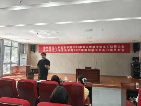 8月27日上午,在学院219多功能厅,我院召开了2022级音乐表演、舞蹈学实习动员大会。杨军副院长,非师范专业实习带队教师、2022级辅导员、教务科老师及2022级非师范专业全体学生参会。杨军副院长在会上做了本次非师范专业实习动员,并向各位同学传达了相关的实习工作安排及各项纪律要求。